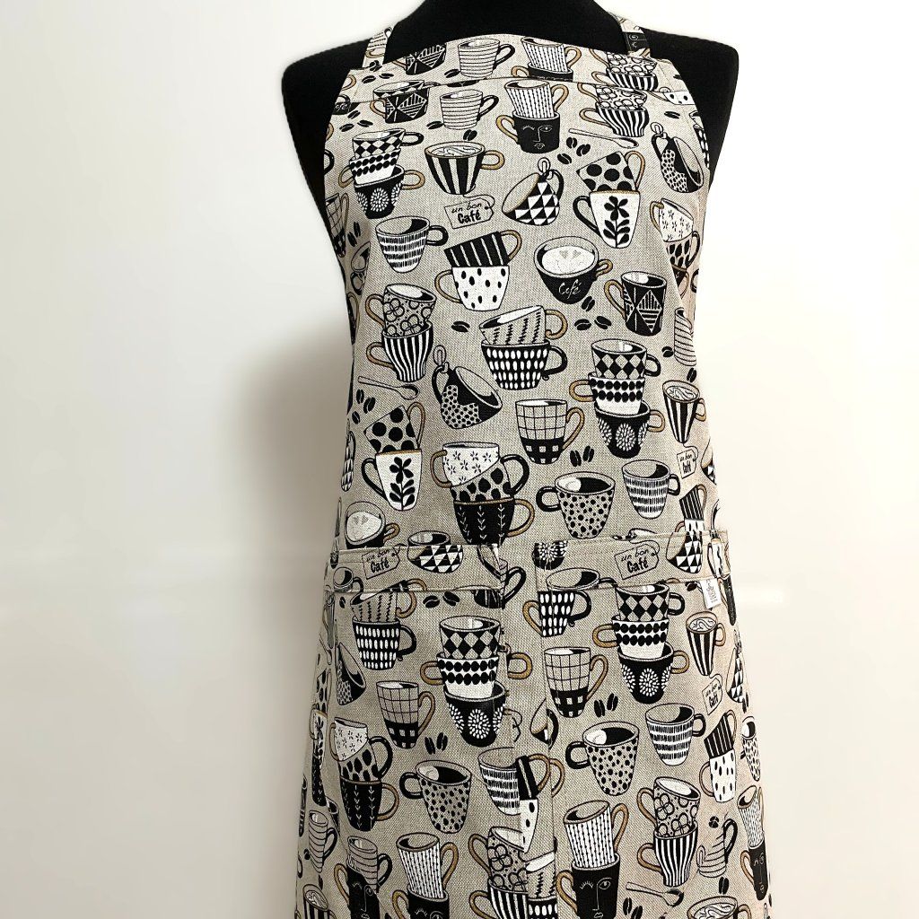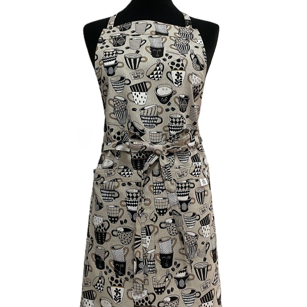 Kuchyňská zástěra z režné látky–kávové hrnky