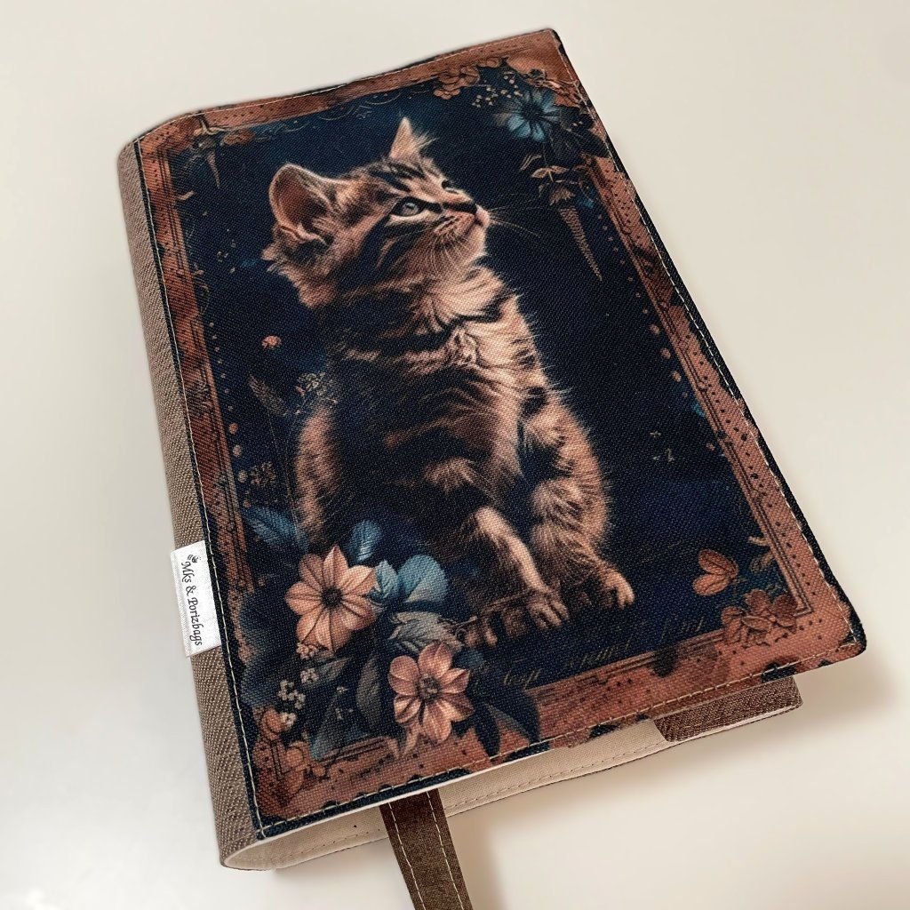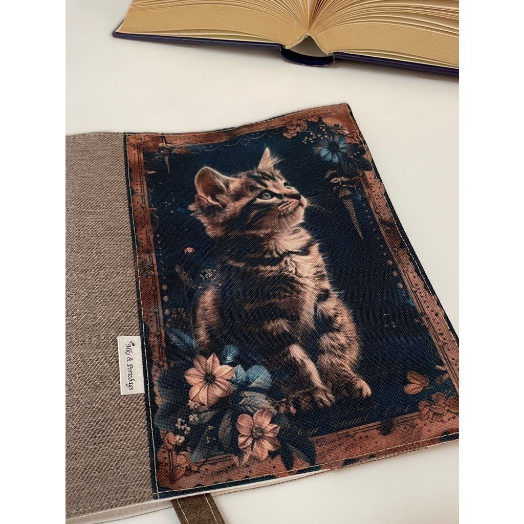 Látkový obal na knihu - hnědé kotě v květinovém rámu