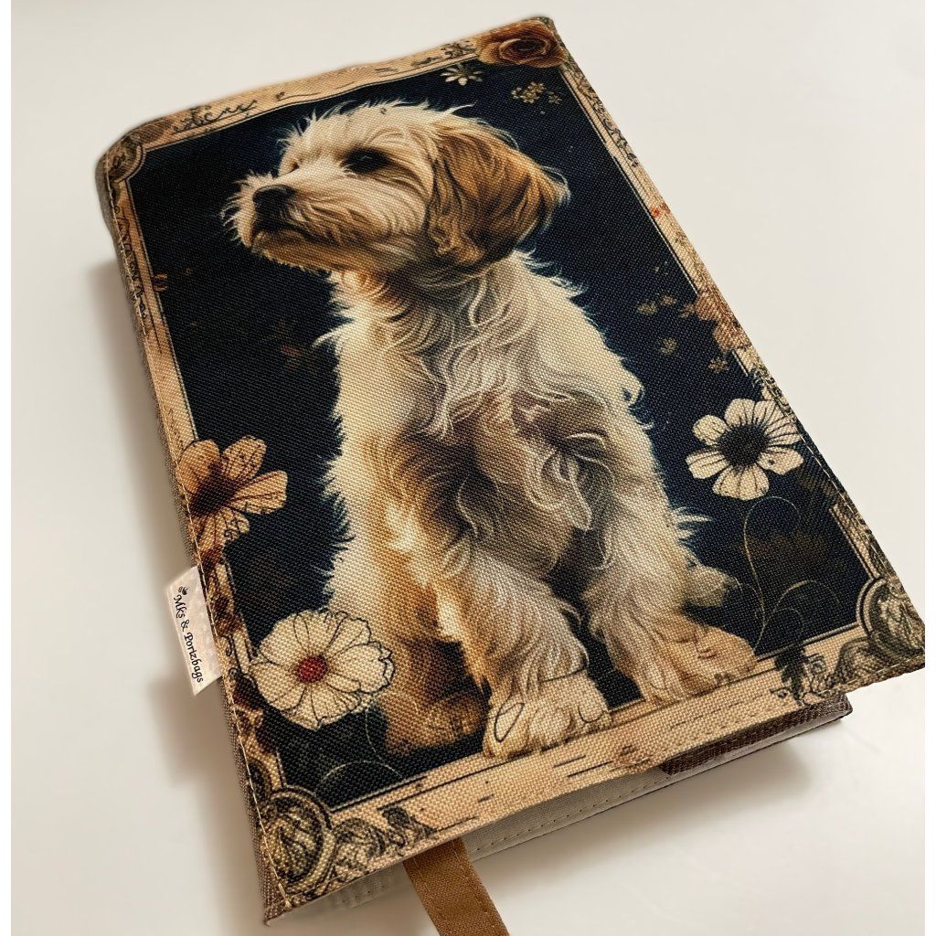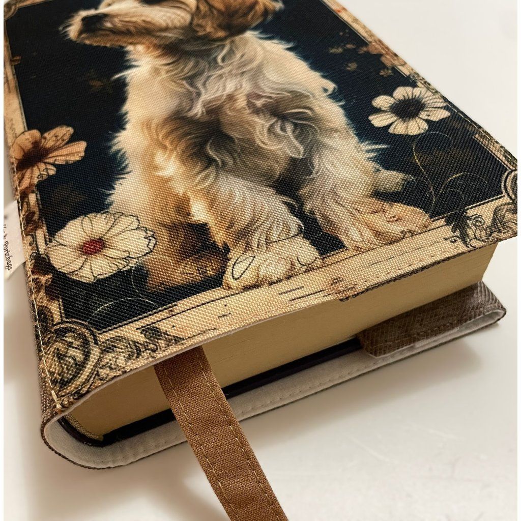 Látkový obal na knihu - pes v květinovém rámu