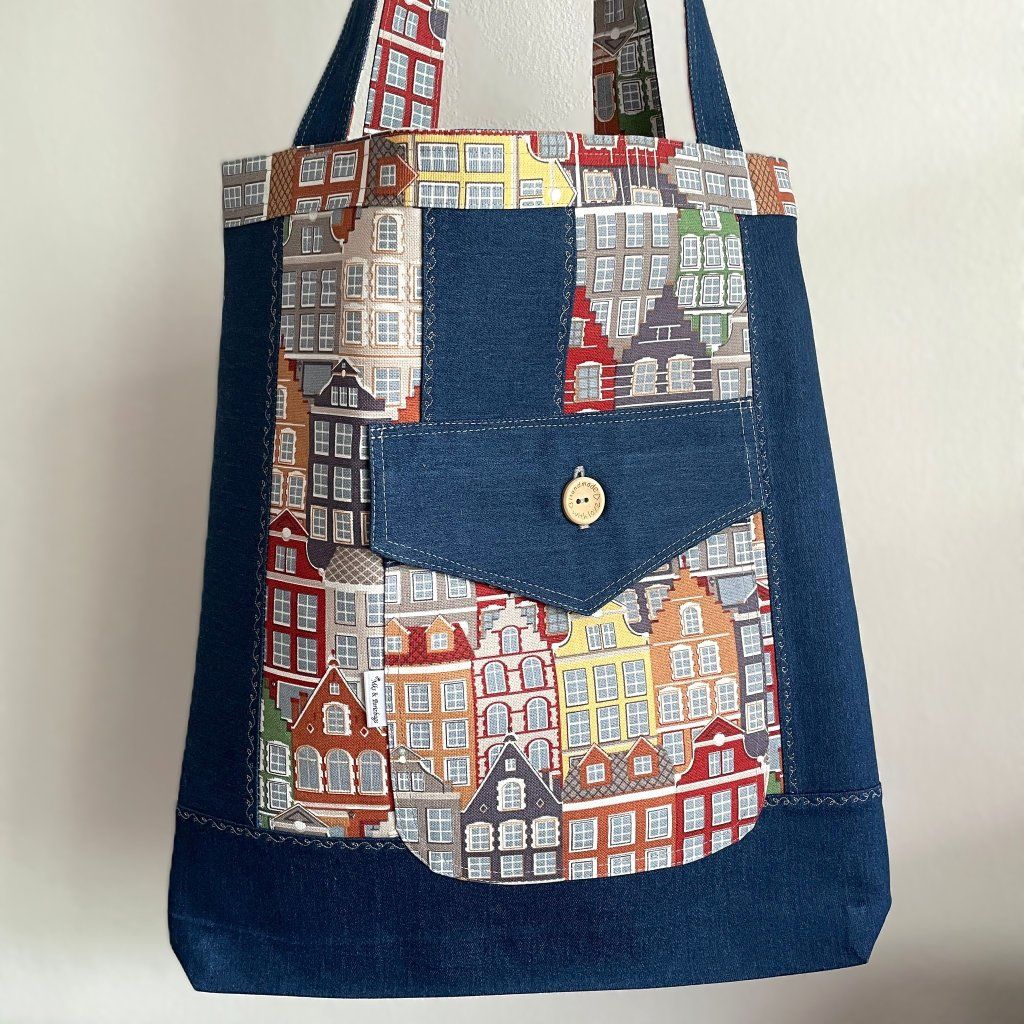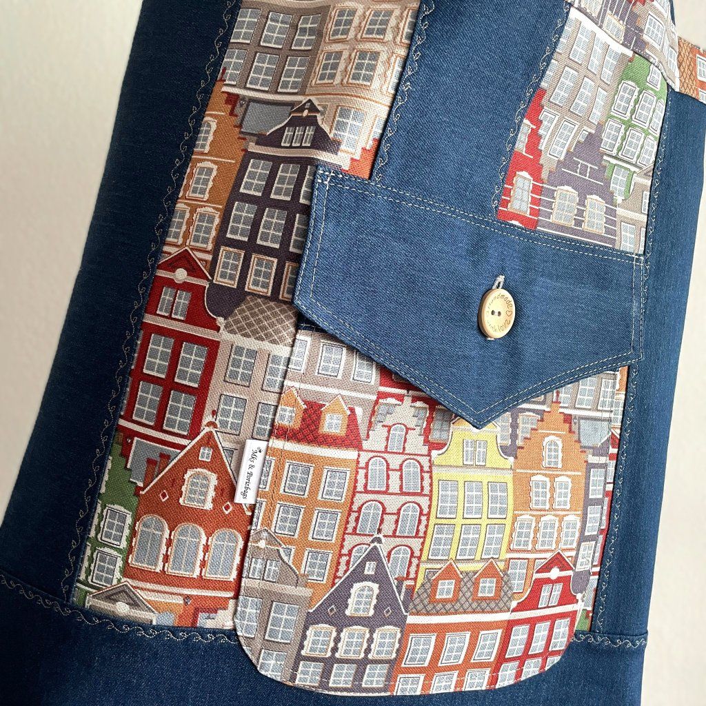 Taška je ušitá z rifloviny v kombinaci s režnou bavlněnou látkou s potiskem. Přední kapsa s klopou.